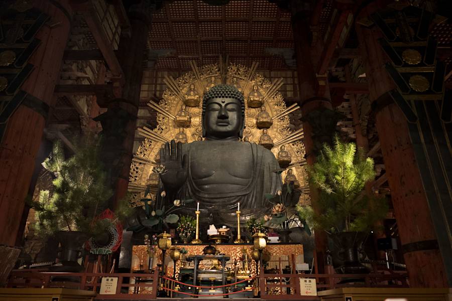 В храме Великого Будды Тодайдзи мы увидим величественную бронзовую статую Будды, сидящего на лепестках священного лотоса. Для её создания в своё время использовали все запасы бронзы в Японии! Масштаб этого сооружения впечатляет: оно весит вдвое больше, чем Статуя Свободы в Нью-Йорке.